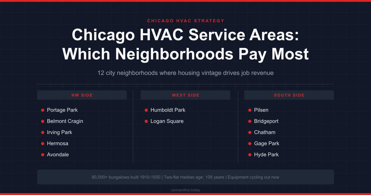 - Housing vintage, not home price, predicts HVAC job revenue. A 1920s Bridgeport bungalow beats a 2010 condo in most of the North Side every time.