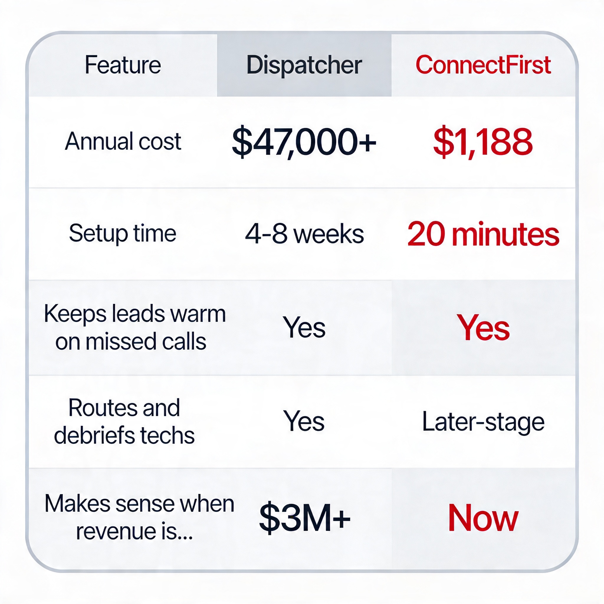 Instant Sales Funnels puts the average monthly cost of missed calls for HVAC contractors at $3,800. I can't confirm that holds for every shop, but the direction is right. During peak season, each missed call is a real job walking to someone else.