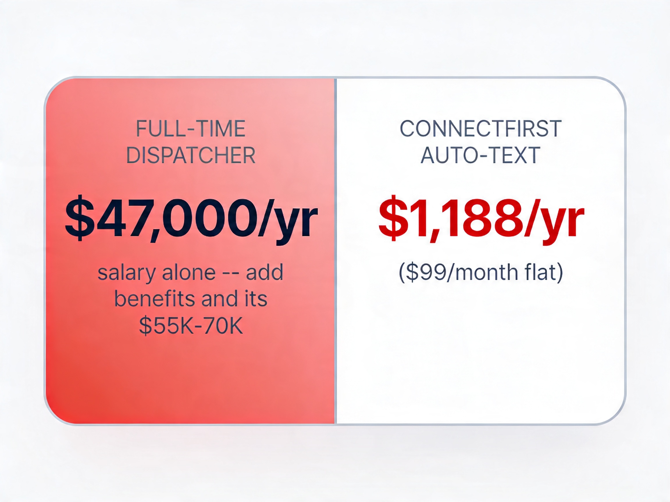 ConnectFirst runs $99/month flat. Twilio SMS pass-through adds about $3–8/month. That's under $110/month all-in, less than a tank of diesel a week.